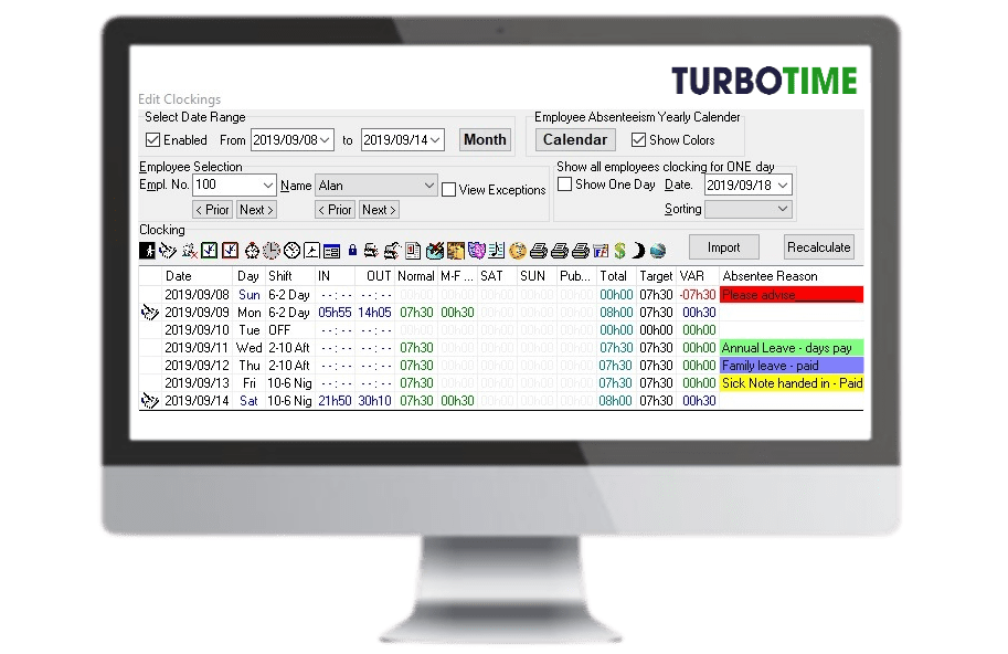 TurboTime is one of the most powerful Time and Attendance packages available on the South African market. (With installations in neighbouring states and as far afield as Belgium). Our easy-to-use system enables an employer to monitor their employee’s working hours and late arrivals, early departures, time taken on breaks, and absenteeism.